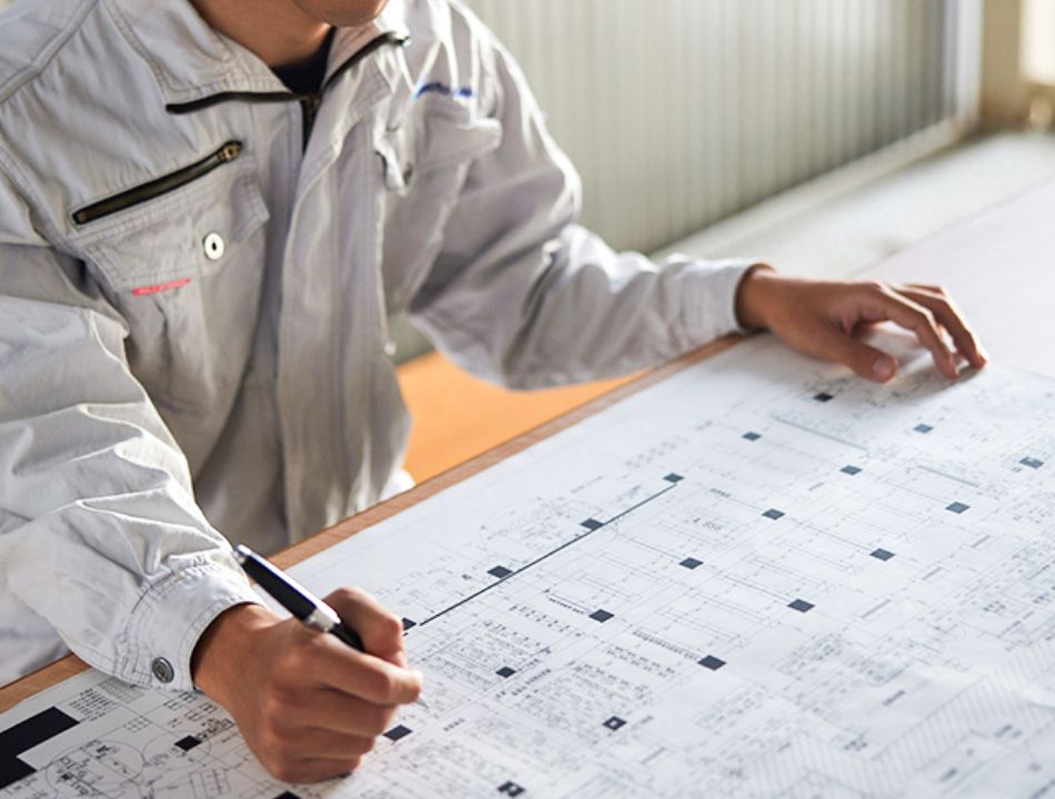 工事管理の仕事は、実際に工事が始まる前からスタートします。まず、設計図を読み込むと同時にお客様のご要望を改めて確認。工期と予算をオーバーしないよう、材料や職人さんの手配をし、工事開始に備えます。工期中も、職人さんやお施主様(お客様)とのコミュニケーションを図り、工事が安全かつ円滑に進むよう調整します。